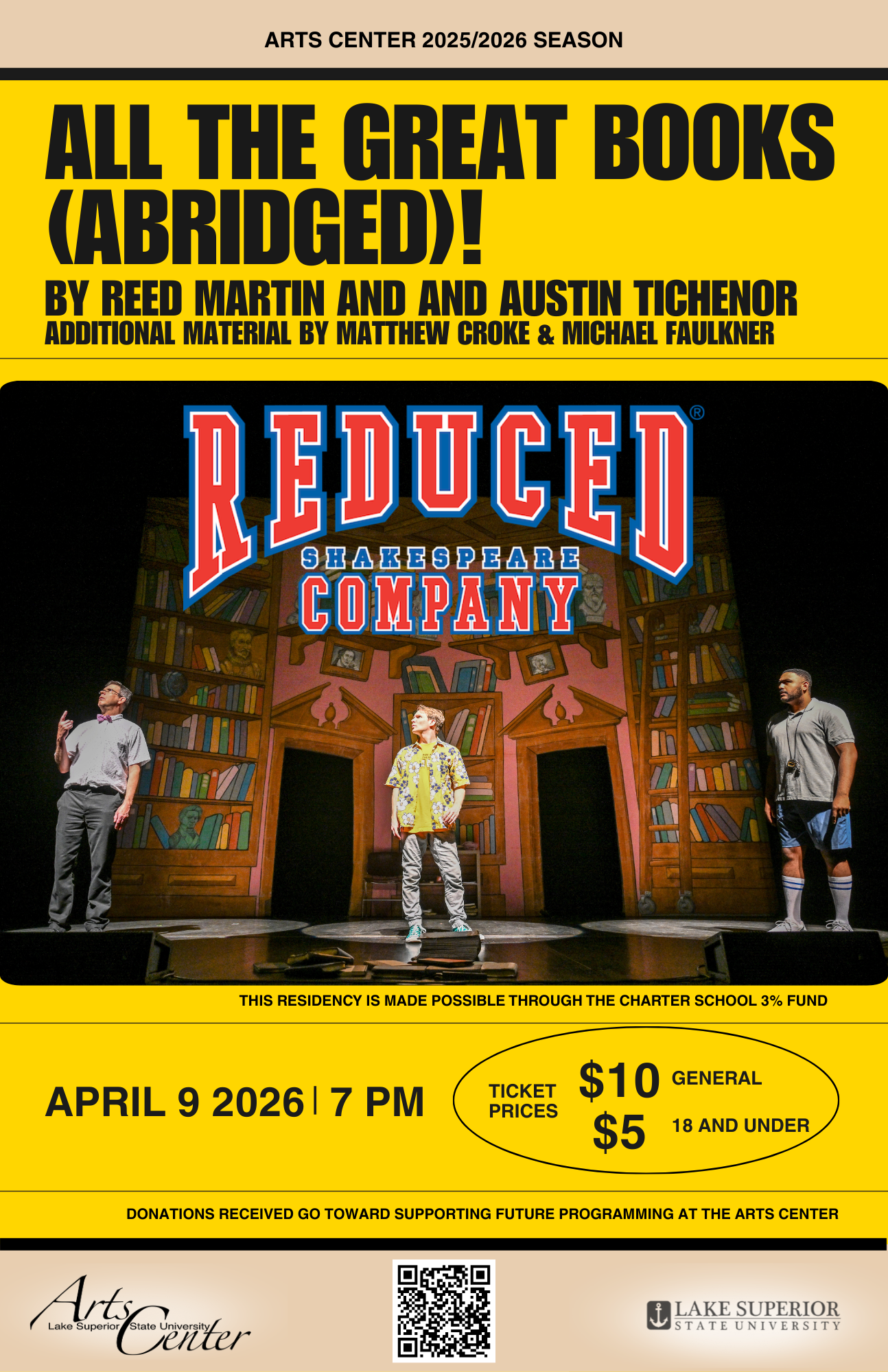 Called a “trio of Modern Marx Brothers” by the Boston Herald and praised as “intellectual vaudeville” by The New York Times, the Reduced Shakespeare Company (RSC) is one of the most celebrated comedy troupes in the world. Known for their lightning-fast wit, improvisational brilliance, and hilarious “abridgments” of massive topics, the RSC has performed everywhere from the White House to London’s West End, where they shattered records with the longest-running comedies in West End history. They’ve toured across the U.S., Europe, the Middle East, Asia, and Australia; appeared frequently on NPR and the BBC; and earned international acclaim for their side-splitting, high-energy performances. Having the RSC perform at the Arts Center is an extraordinary opportunity to experience one of the world’s most inventive and beloved comedic institutions—right here in Sault Ste. Marie.