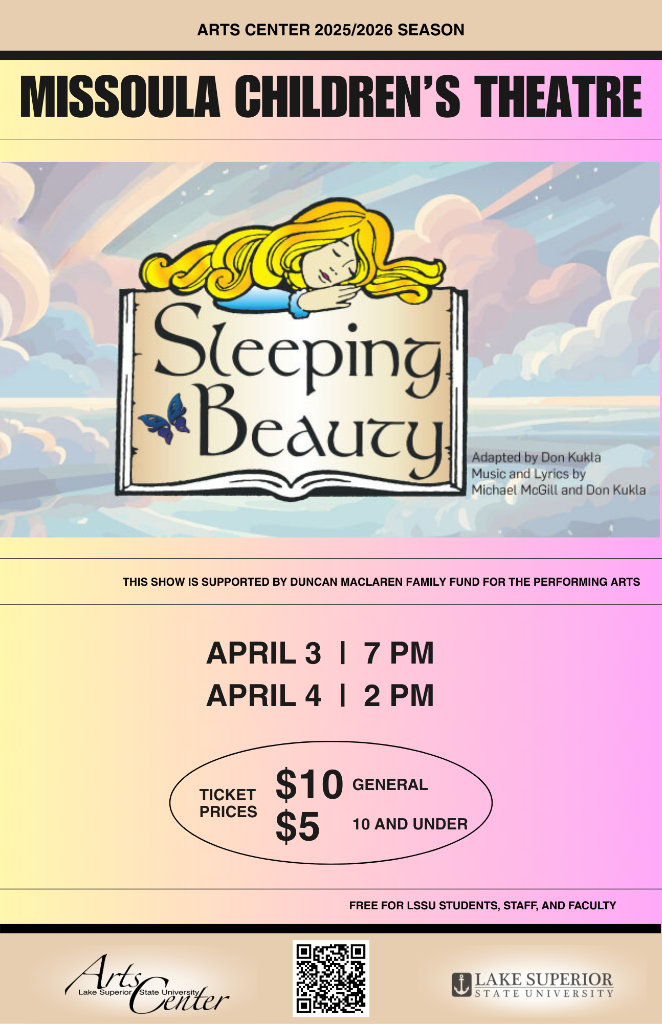Due to popular demand, the Missoula Children’s Theatre Red Truck Tour is returning to the Arts Center! This beloved week-long residency gives young performers in Sault Ste. Marie an exciting chance to rehearse, create, and shine on stage in a fully produced musical. This year’s production of Sleeping Beauty brings the classic tale to life with Missoula’s signature humor, color, and creativity. Come cheer on our community’s young artists as they step into the spotlight for two magical performances.