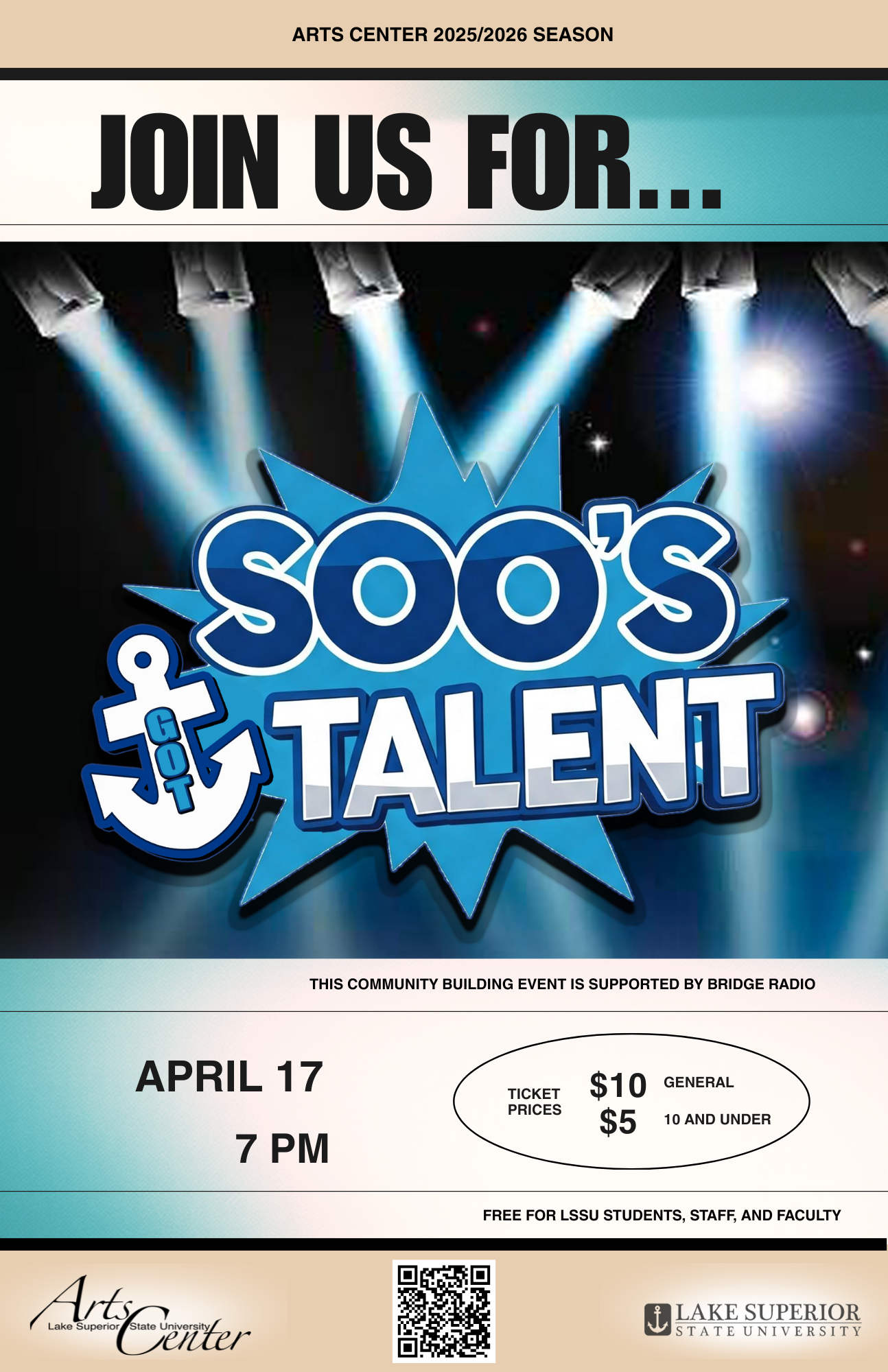Back by popular demand, Soo’s Got Talent returns to the Arts Center for another unforgettable night of community-wide creativity! From singers to dancers, comedians to magicians, and everything in between, this county-wide talent showcase celebrates the incredible variety of performers who call Sault Ste. Marie home. Join us for an evening of surprises, standout moments, and heartfelt hometown pride as local talent lights up the stage once again.
