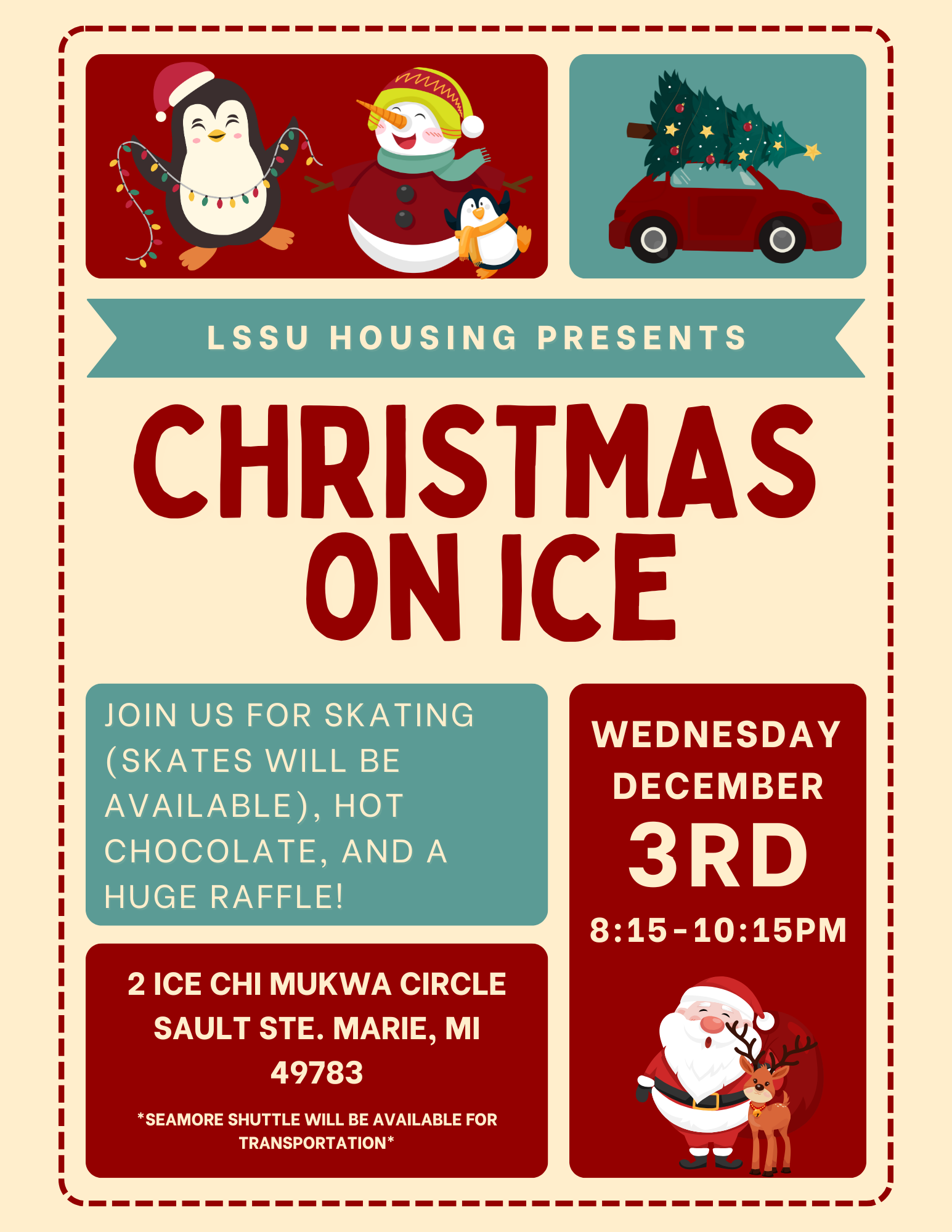 Join the Housing Office for CHRISTMAS ON ICE from 8:15-10:15pm on Wednesday, December 3rd! This event will be at 2 Ice Chi Mukwa Circle, Sault Ste. Marie MI. There will be skates available, hot chocolate, and huge giveaways!