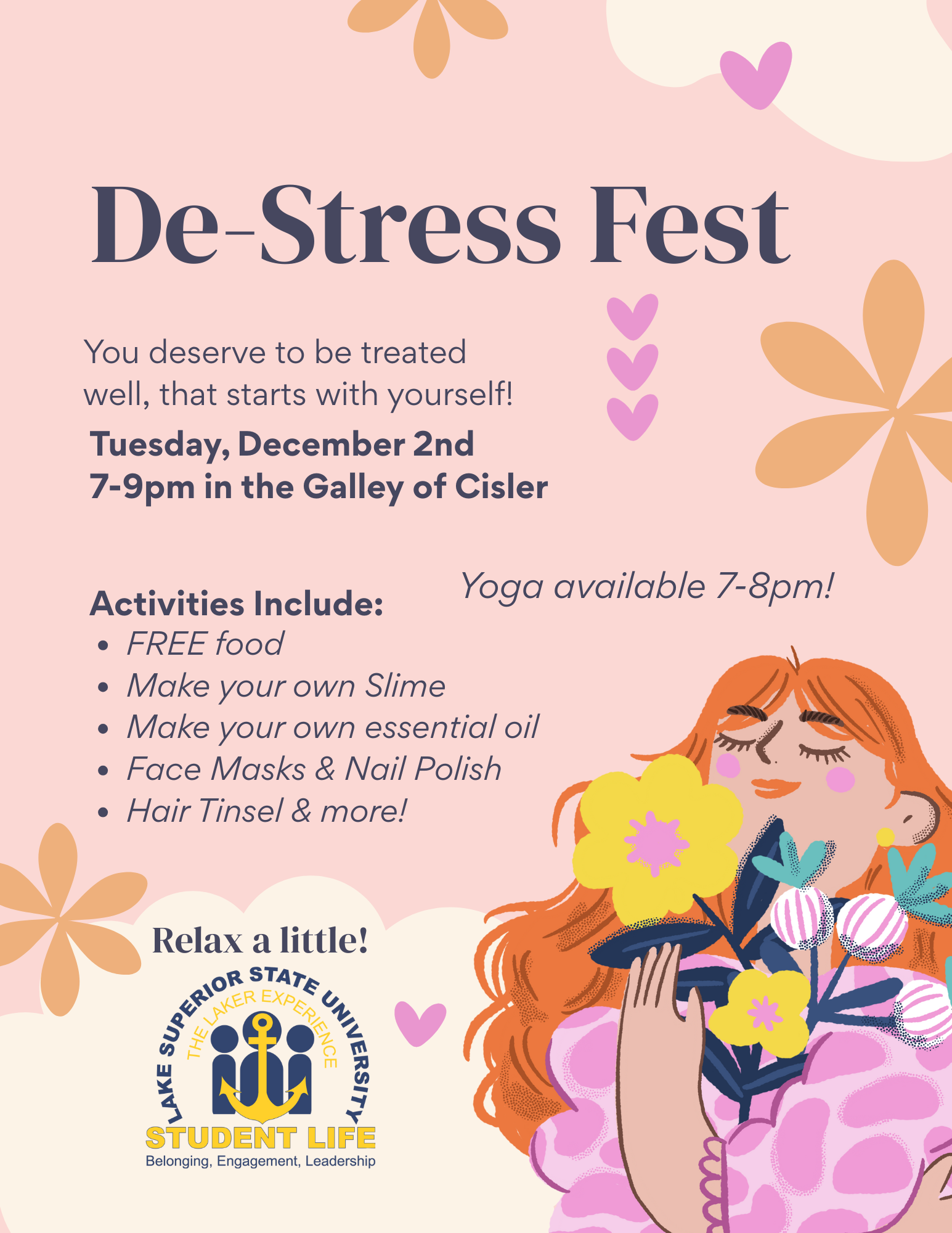 Come to the De-Stress Fest sponsored by the Office of Student Life on Tuesday, December 2nd from 7-9pm in the Galley of the Cisler Center! We will have free food, giveaways, self-care, community, and free yoga! You WON’T want to miss this!